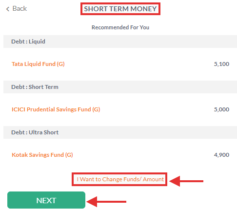 For example, the “Save smart” option is selected (highlighted above). Next, a predefined short term money plan is shown below;
