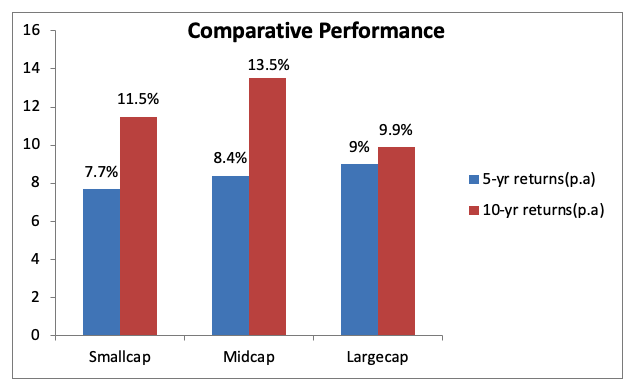 Contrary to popular wisdom, investors haven’t benefitted much by choosing small cap over that of mid cap or large caps over the long-term. Limit small cap investments to a small portion of your portfolio if at all. Else, you are better off with other diversified equity funds.