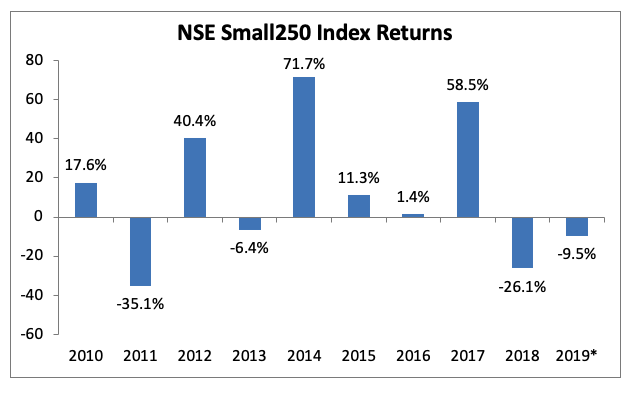 Small cap funds do well in rising markets but also might take a beating during downturns. After a rollicking year in 2017, when NSE Small cap 250 index gave a return of 59 percent, it has been lagging the returns of that of large cap and mid-cap indices in 2018 and 2019.